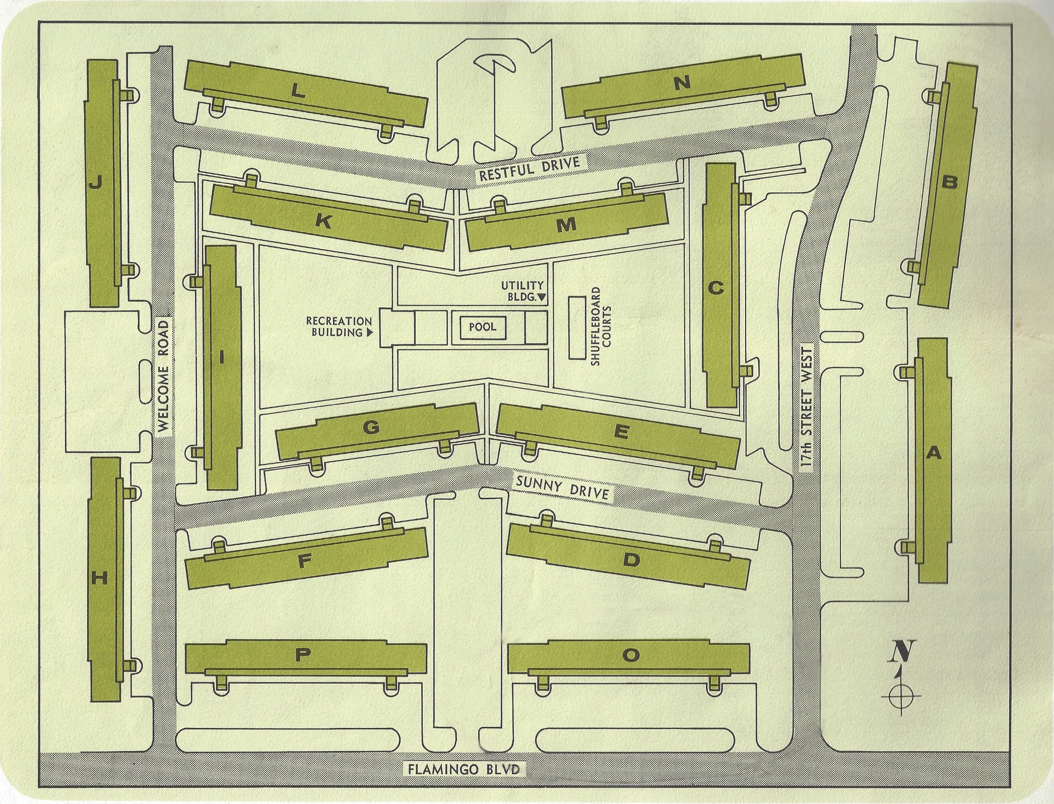 The Second Bayshore building layout, ca. 1970, with buildings labeled from A through P, and bounded by Flamingo Blvd on the South end, Welcome Road on the West, Restful Drive on the North, and 17th Street West on the East. Also on the map are a Utility Building, a Recreation Building, a Pool, and Shuffleboard courts. Locations and dimensions of the present courtyard building, pool, and shuffleboard courts were amended to their present locations after this advertisement was published. Building P was subsequently sold, and is no longer part of Second Bayshore Condominium Association.